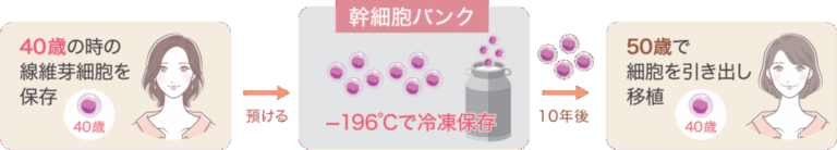 線維芽細胞療法では、患者様ご自身の線維芽細胞を採取し、細胞培養加工施設で培養・増殖させた後、肌の気になる部分へ移植します。これにより、コラーゲン産生が活発になり、肌のハリや弾力が向上します。シワやたるみの改善が期待できる治療法です。