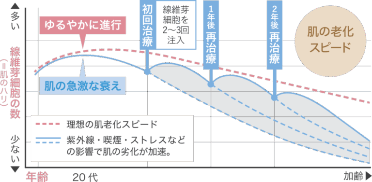 肌の真皮に存在する線維芽細胞は、幹細胞から分化して生まれ、コラーゲンなどの美肌成分を生成しています。しかし、加齢とともに線維芽細胞の数が減少し、その働きも低下するため、シワやたるみといった肌老化の原因となります。