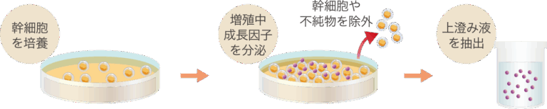 ヒト幹細胞培養上清は、体内の脂肪・骨髄・歯髄・臍帯(さいたい)などから採取した幹細胞を培養し、その上澄み液を高純度に抽出したものです。この液体には、抗炎症作用、血流・代謝増強作用、細胞増殖作用を持つ300種類以上の成長因子やサイトカイン、細胞間の情報伝達に重要な役割を担うエクソソームが含まれており、損傷を受けた細胞や組織の修復を促進します。当クリニックでは、日本バイオセラピー研究所で培養・加工された高品質なヒト幹細胞培養上清StemSup®を使用しています。