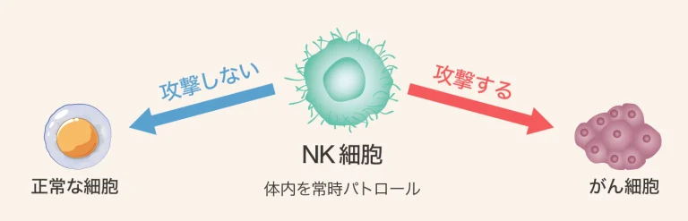 NK細胞(ナチュラルキラー細胞)は白血球の一種で、リンパ球の中でも特に素早く異常な細胞を見つけ、攻撃する能力を持つ免疫細胞です。がん細胞やウイルスに感染した細胞を察知すると、即座に排除しようと働きます。この高い殺傷能力と素早い反応により、体の防御システムを支える重要な存在とされています。