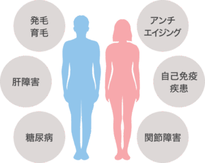 幹細胞を投与することで、ケガや病気で傷ついた組織に集まり、必要な細胞へと変化しながら新しい細胞を生成します。関節症や皮膚損傷、自己免疫疾患などの幅広い疾患に対応し、拒絶反応が少ない安全性の高い再生医療として注目されています。